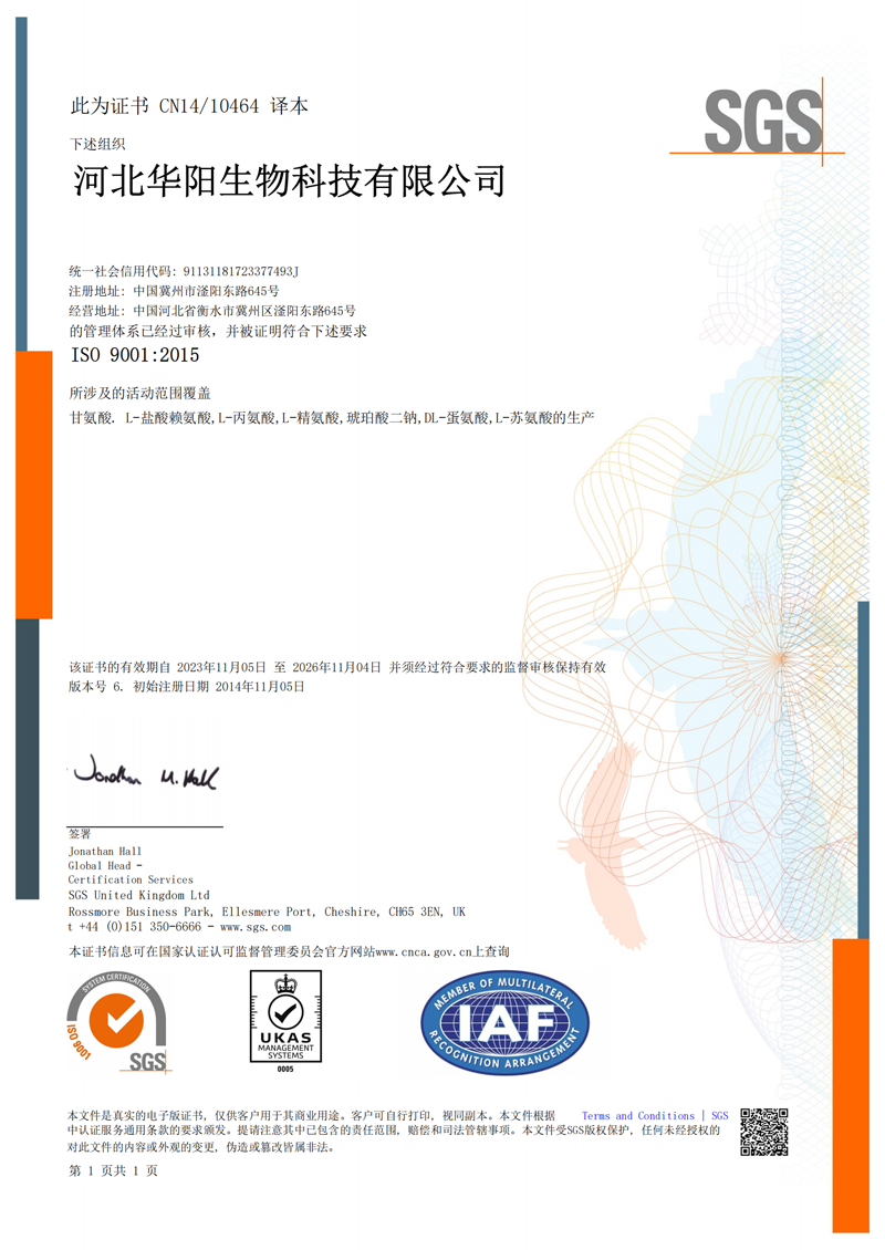 河北華陽集團坐落于河北省衡水市冀州區(qū)省級工業(yè)園區(qū)(始建于1987年,前身為冀州市華陽化工有限責任公司)。集團下屬四個公司:河北華陽生物科技有限公司、河北華悅氨基酸科技有限公司、滄州華晨生物科技有限公司、衡水市陽力商貿有限公司。主要生產甘氨酸、L-丙氨酸、L-蘇氨酸、DL-蛋氨酸、L-賴氨酸鹽酸鹽、L-半胱氨酸鹽酸鹽、干貝素等氨基酸系列食品級產品,廣泛應用于食品、飲料、飼料等行業(yè)。......